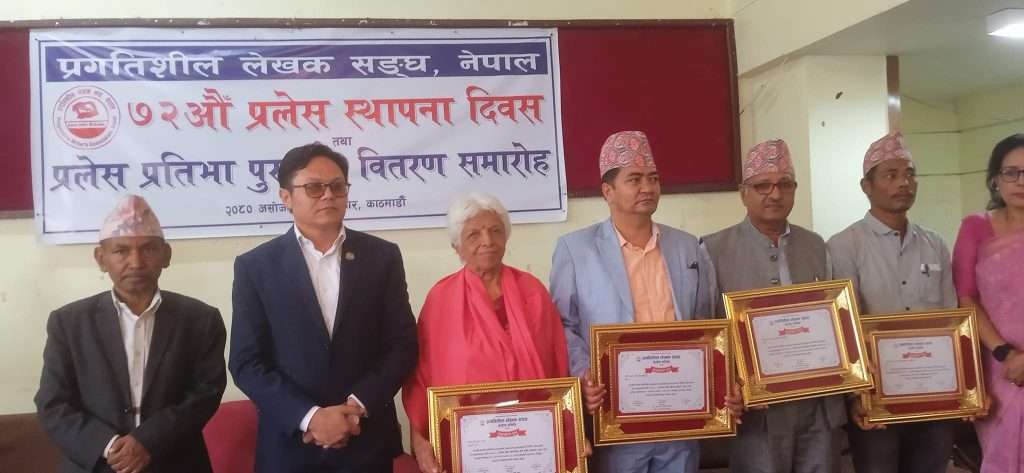 स्थापना दिवसको अवसरमा विभिन्न चार विधामा प्रलेस प्रतिभा पुरस्कारबाट सम्मानित गरिएको थियो । त्यसरी सम्मानित हुनेहरूमा रु.२५,१०० राशिसहित प्रलेस श्यामप्रसाद स्मृति पुरस्कारबाट कुन्ता शर्मा, रु.२०,१०० राशिसहित प्रलेस प्रतिभा पुरस्कारबाट नरेश भण्डारी, रु.१०,१०० राशिसहित प्रलेस बाल साहित्य पुरस्कारबाट प्रा.डा. कपिल लामिछाने र रु.१०,१०० राशिसहित प्रलेस युवा पुरस्कारबाट गुरुप्रसाद कुमाल ‘बुलबुल’लाई सम्मानित गरिएको थियो । सोही अवसरमा अन्तरवार्ता विशेषाङ्क, प्रलेस २८ समेत प्रमुख अतिथि मन्त्री किराँतीबाट विमोचित गरिएको थियो ।
