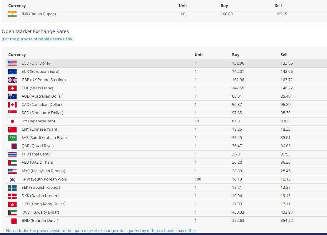 राष्ट्र बैंकले आजका लागि अमेरिकी डलरको १ को खरिद दर १३२ रुपैयाँ ९६ पैसा र बिक्री दर १३३ रुपैयाँ ५६ पैसा कायम गरेको छ भने युरोपियन युरो एकको खरिद दर १४२ रुपैयाँ ०१ पैसा र बिक्री दर १४२ रुपैयाँ ६६ पैसामा कारोबारको अनुमति दिएको छ ।
