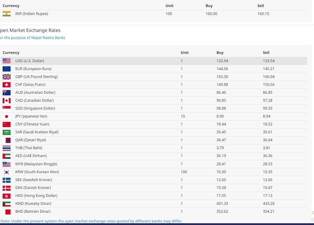 राष्ट्र बैंकले आजका लागि अमेरिकी डलरको १ को खरिद दर १३२ रुपैयाँ ९४ पैसा र बिक्री दर १३३ रुपैयाँ ५४ पैसा कायम गरेको छ भने युरोपियन युरो एकको खरिद दर १४४ रुपैयाँ ५६ पैसा र बिक्री दर १४५ रुपैयाँ २१ पैसामा कारोबारको अनुमति दिएको छ ।