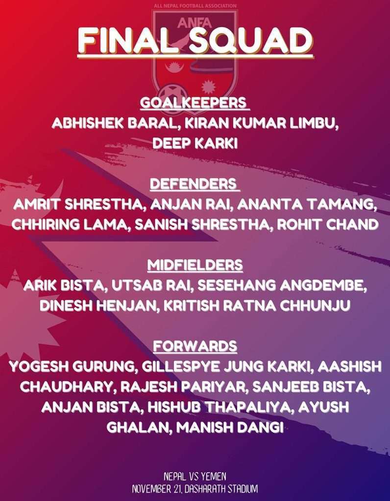 राष्ट्रिय टिमका मुख्य प्रशिक्षक भिन्चेन्सो अल्बर्टो एनेसले यमनविरुद्ध खेल्ने २३ सदस्यीय टोलीको घोषणा गरेका हुन् ।