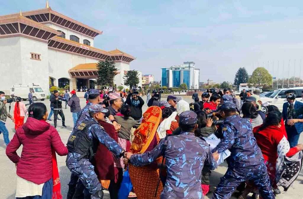 प्रहरीका अनुसार गेटमा भित्रबाट बोलाएको भन्दै सुरक्षाकर्मीलाई झुक्काएर उनीहरू भित्र छिरेका थिए । गेटभित्र छिरेपछि नाराजुलुस गर्न थालेपछि उनीहरूलाई नियन्त्रणमा लिइएको थियो ।