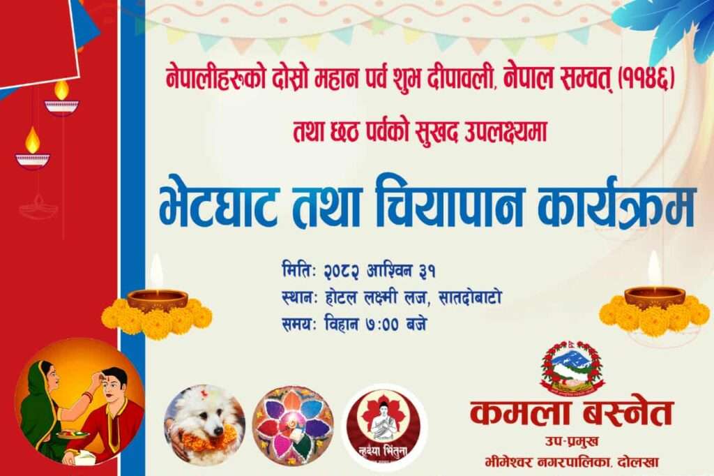 दोलखाको भीमेश्वर नगरपालिकाकी उप–मेयर तथा नेकपा (एमाले) जिल्ला कमिटीकी सह–सचिव कमला बस्नेतले शुभ दीपावली तथा छठ पर्वको अवसरमा लक्ष्मी लज, चरिकोटमा विशेष भेटघाट तथा चियापान कार्यक्रम आयोजना गर्ने भएकी छन्।
